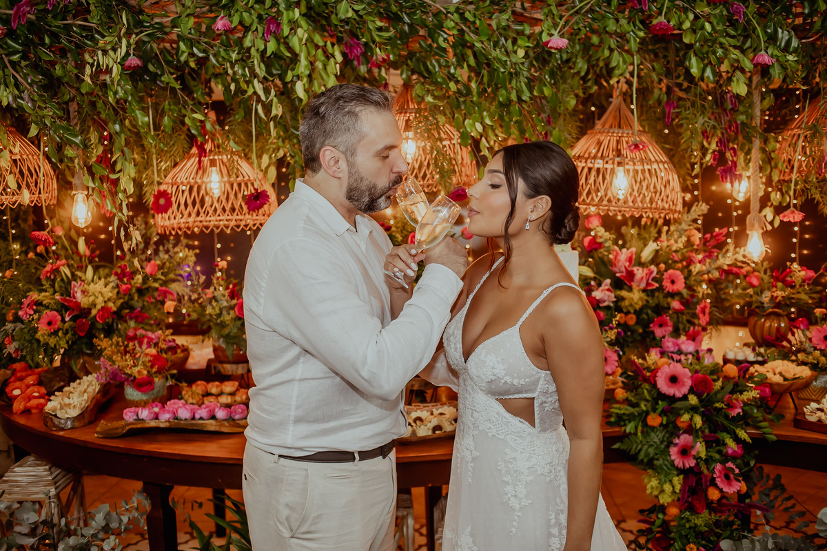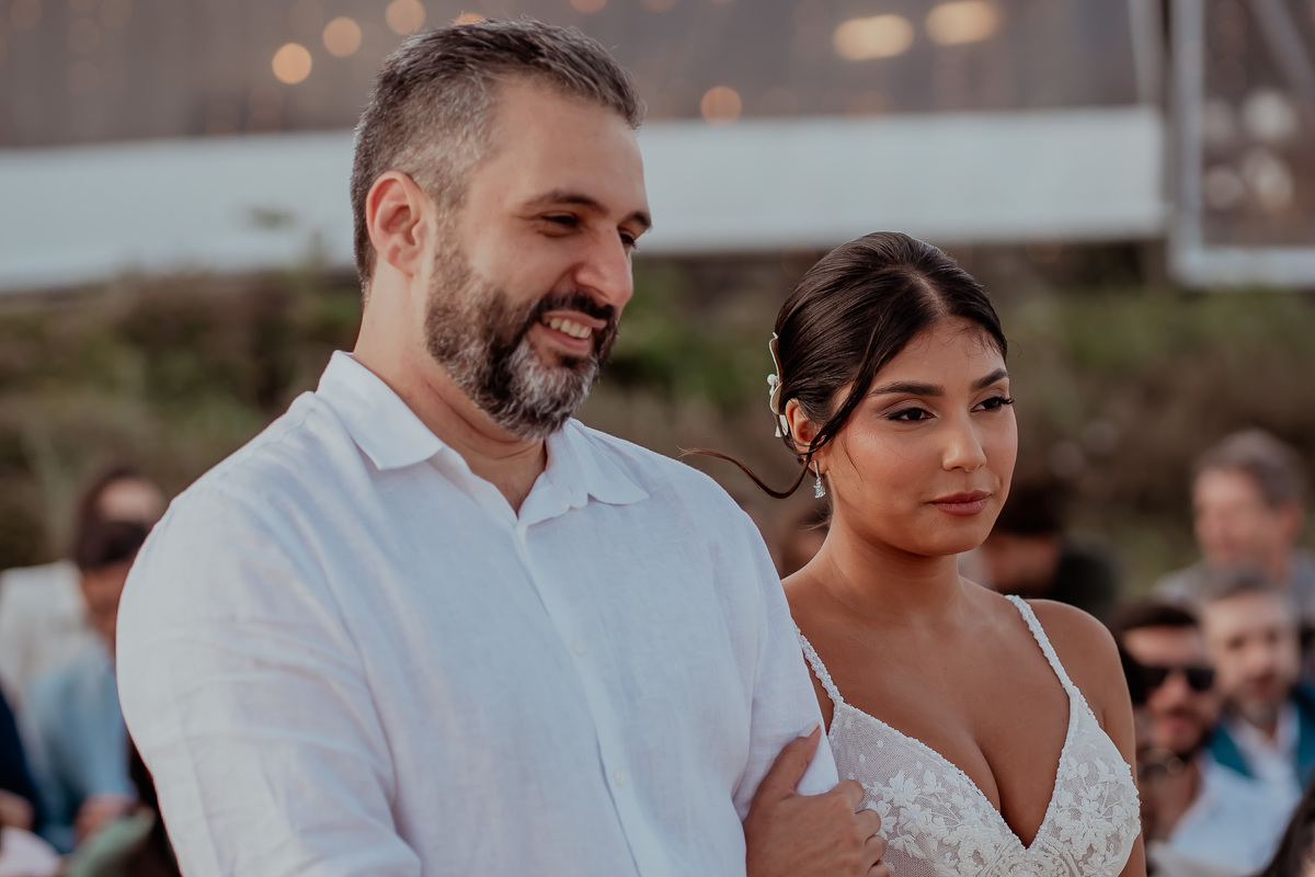 Nataly e Andrei celebraram seu amor em um cenário paradisíaco à beira-mar, na deslumbrante Praia do Rio de Janeiro. A noiva, minimalista e elegante, brilhou com um coque impecável e vestido sereia que realçou sua beleza natural, enquanto o noivo, clássico e sofisticado, vestiu um terno sob medida.